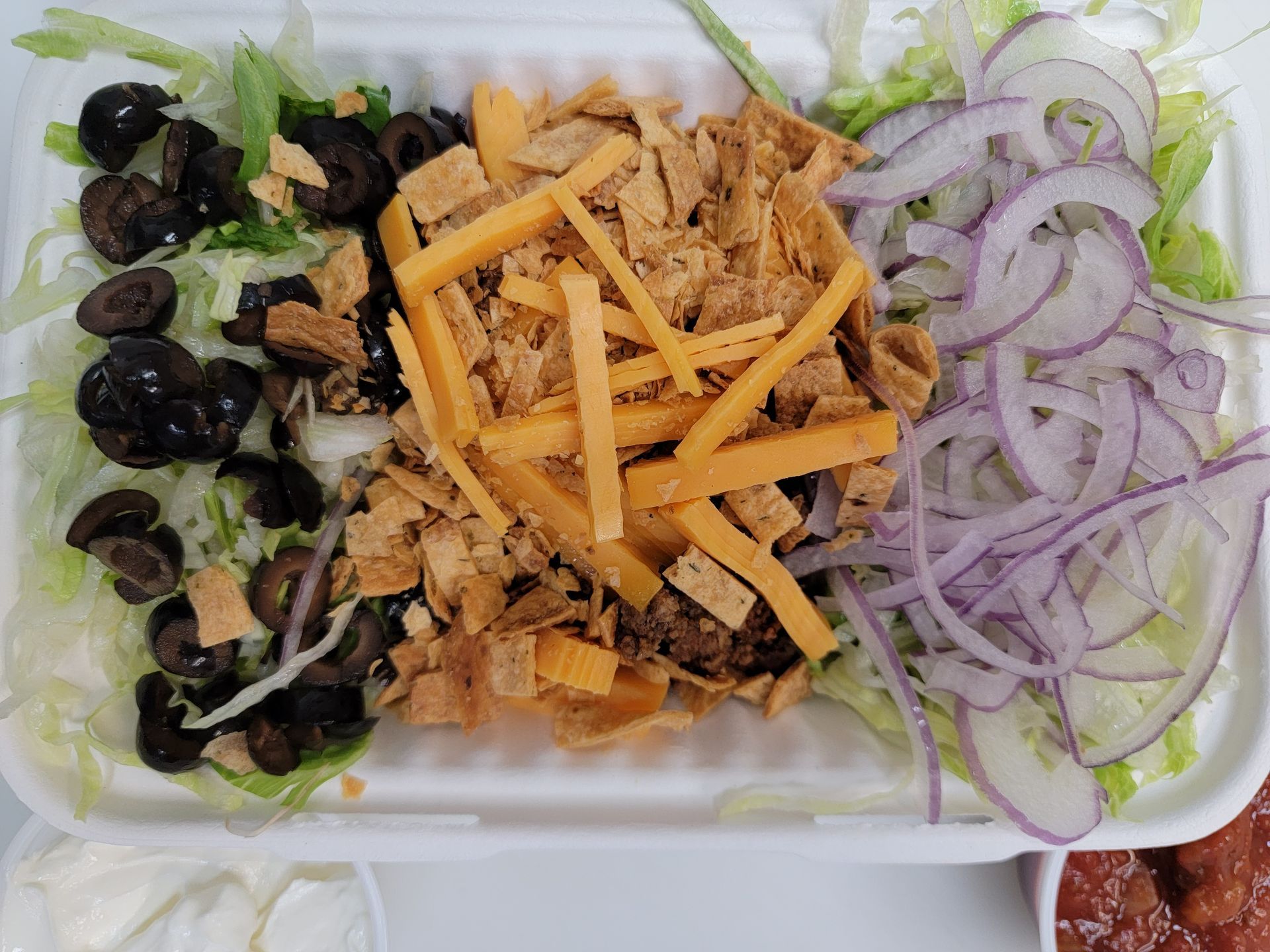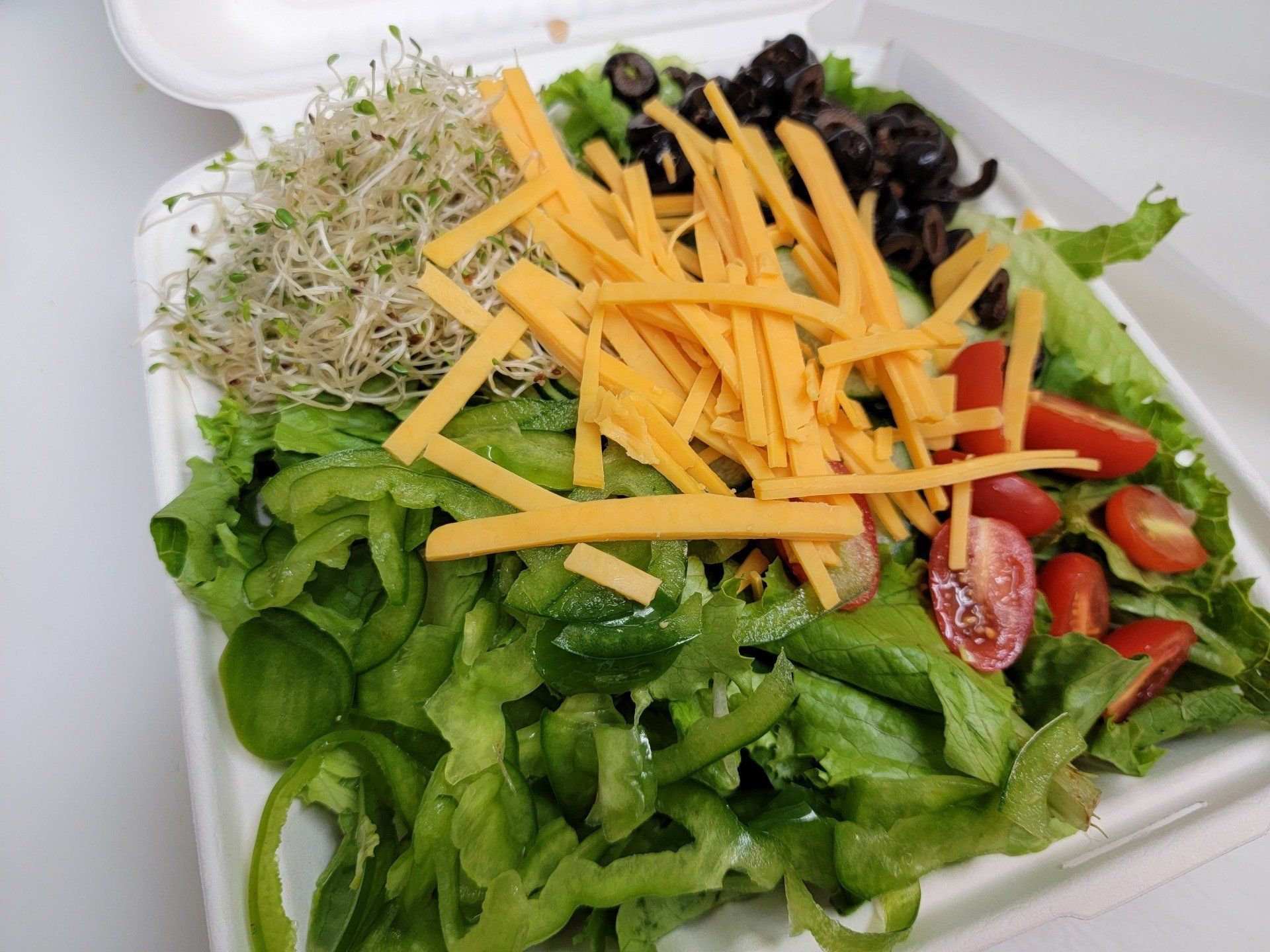 Served with Cheddar cheese, sprouts, grape tomatoes, cucumbers, green peppers & black olives