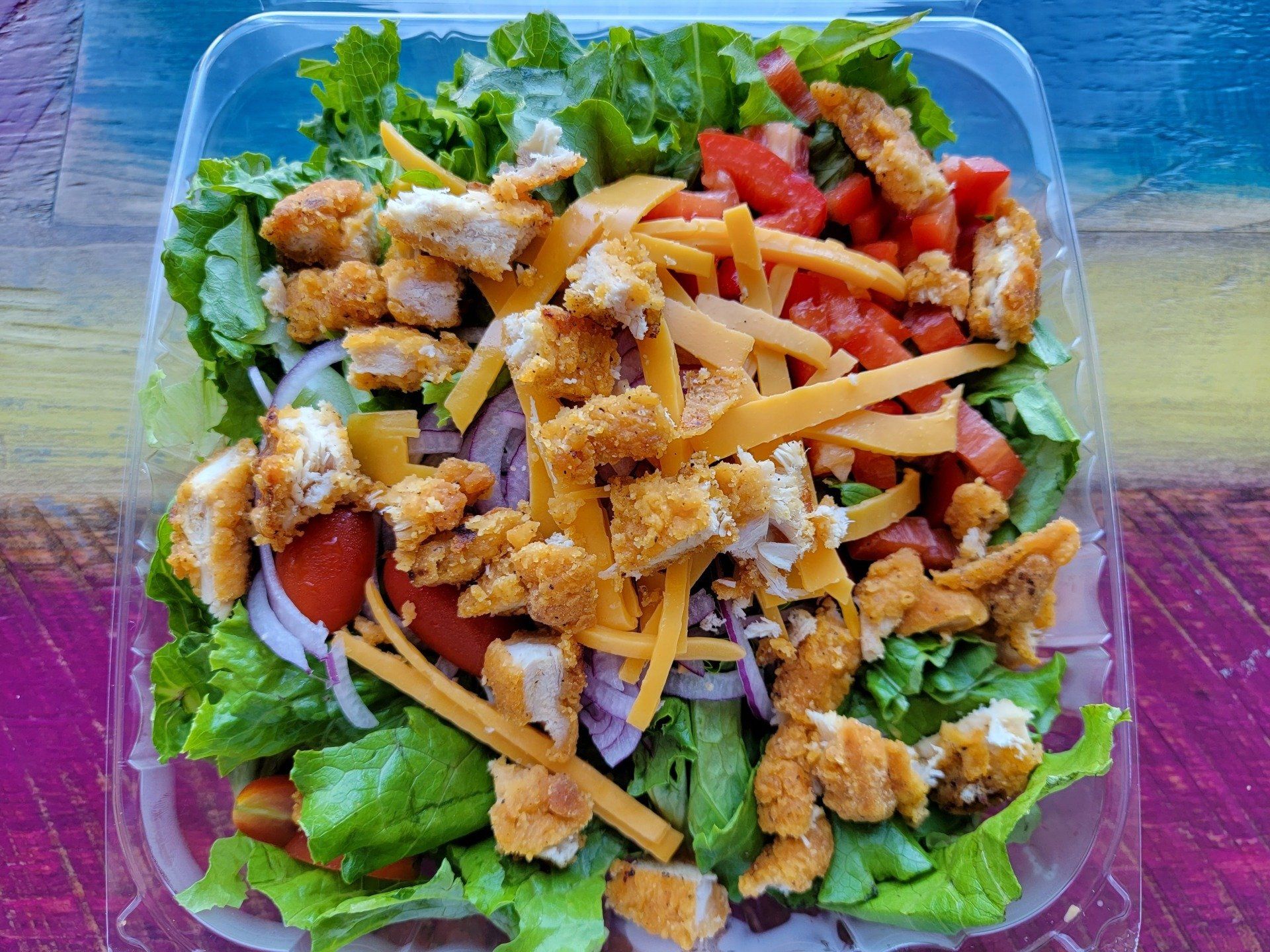 Served with blue cheese, crumbled blue cheese, bacon, cucumbers, avocado, grape tomatoes