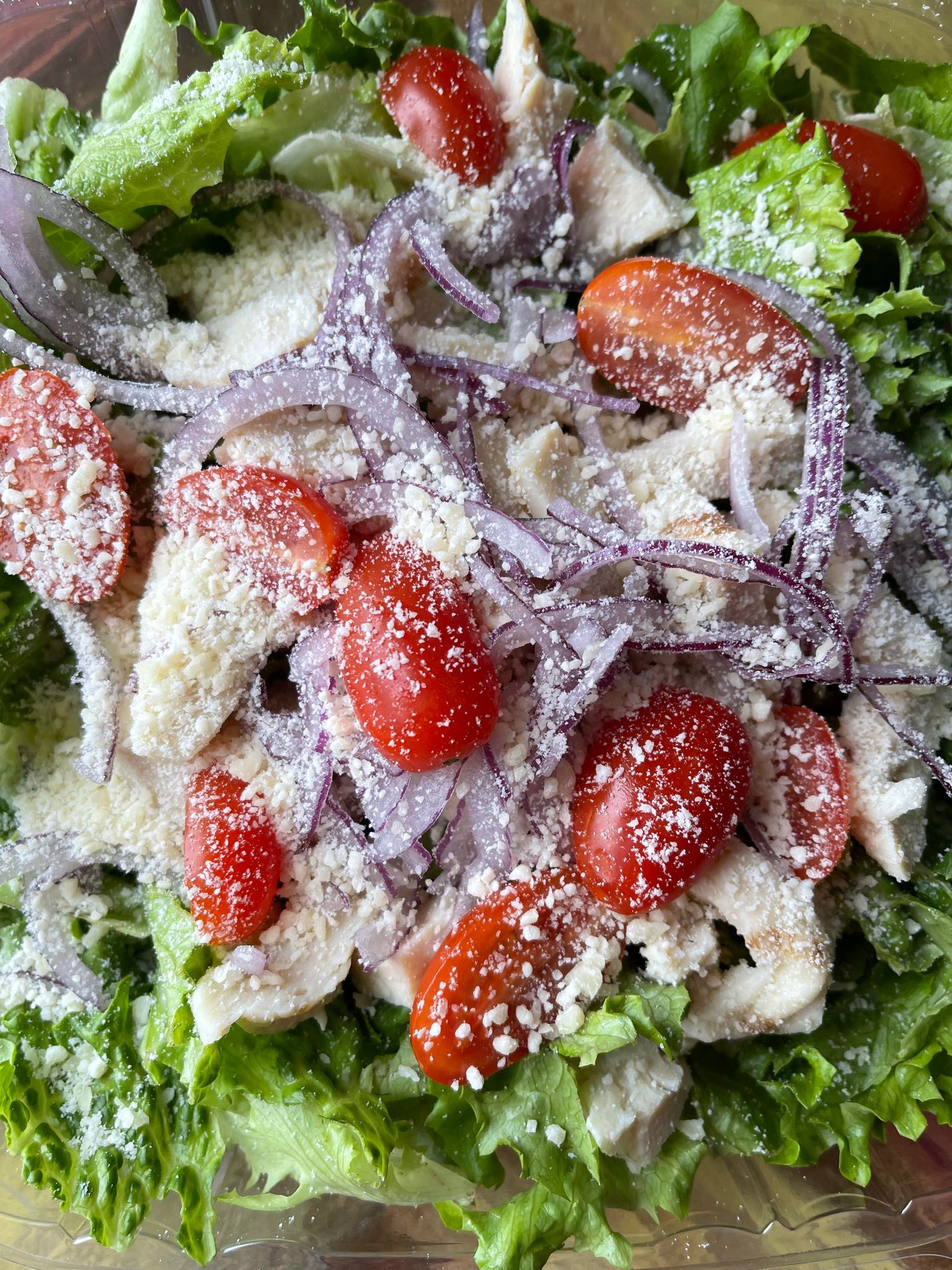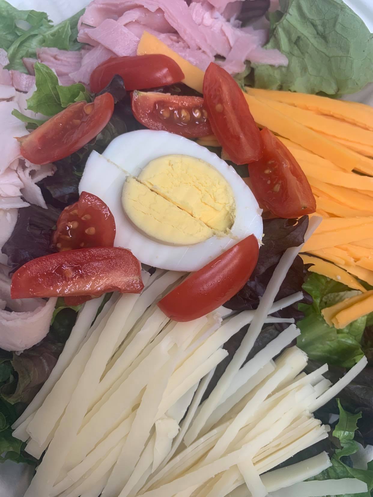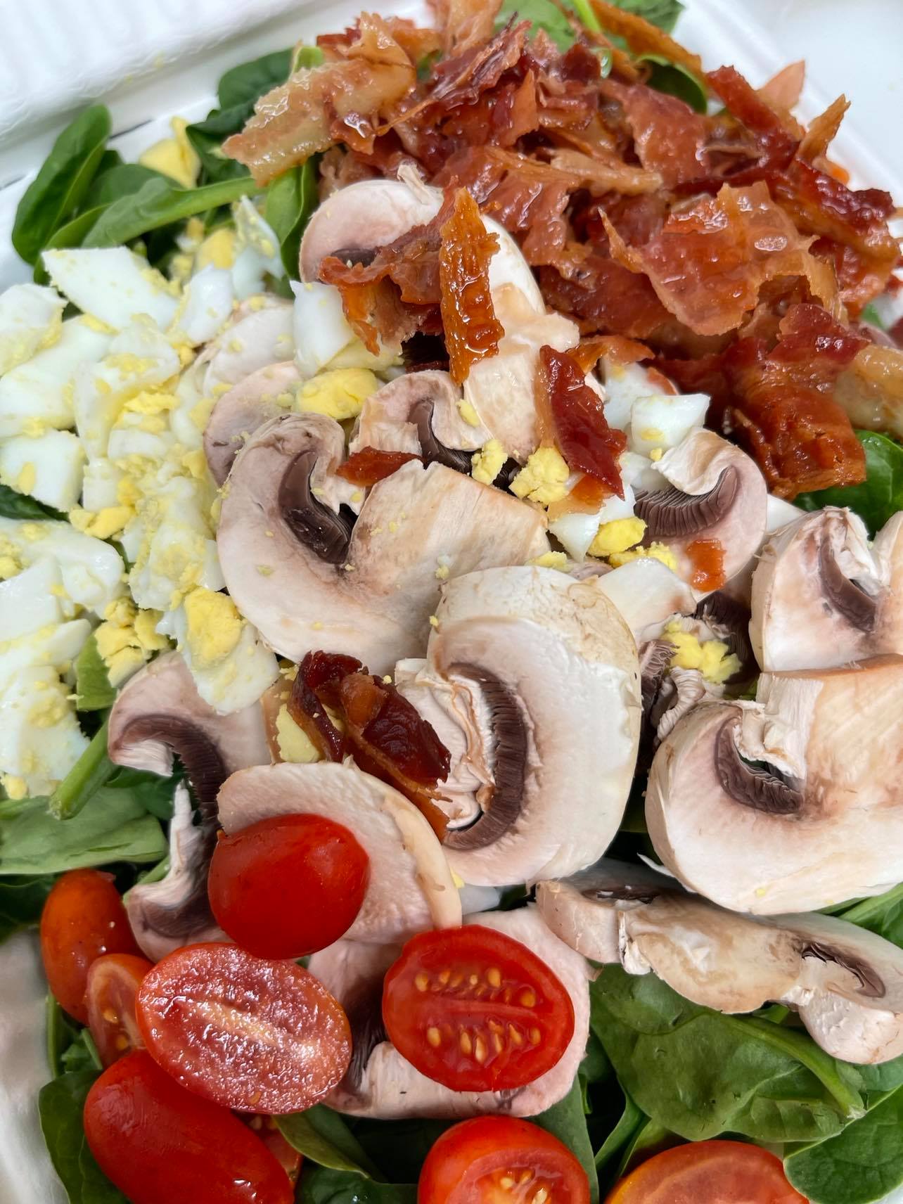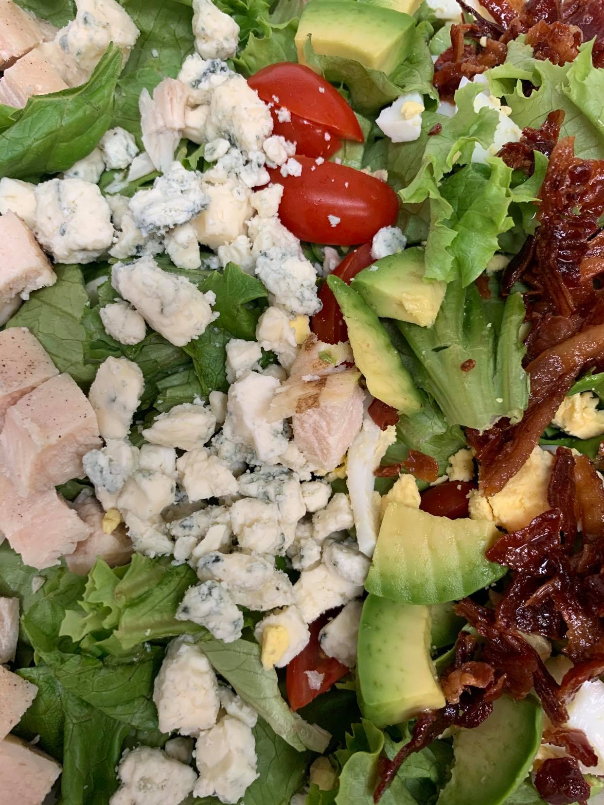Salad served with crumbled blue cheese, bacon, avocado, chicken, egg & grape tomatoes