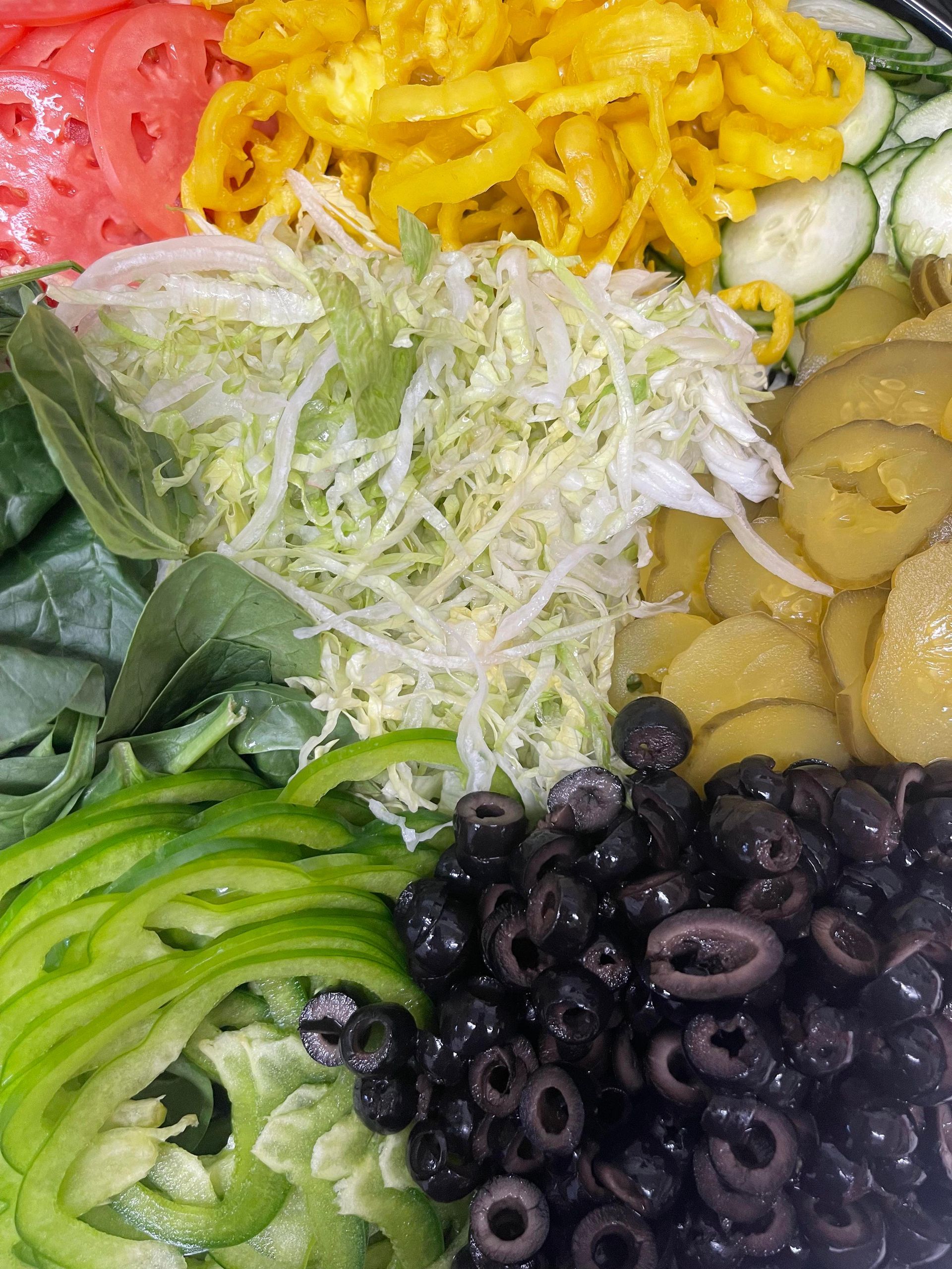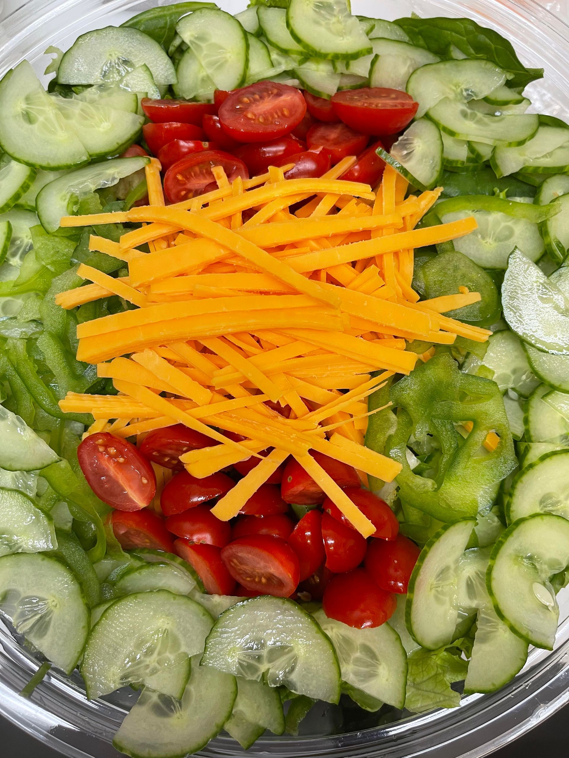 Cucumbers, grape tomatoes, cheddar cheese, baby spinach, green peppers & black olives